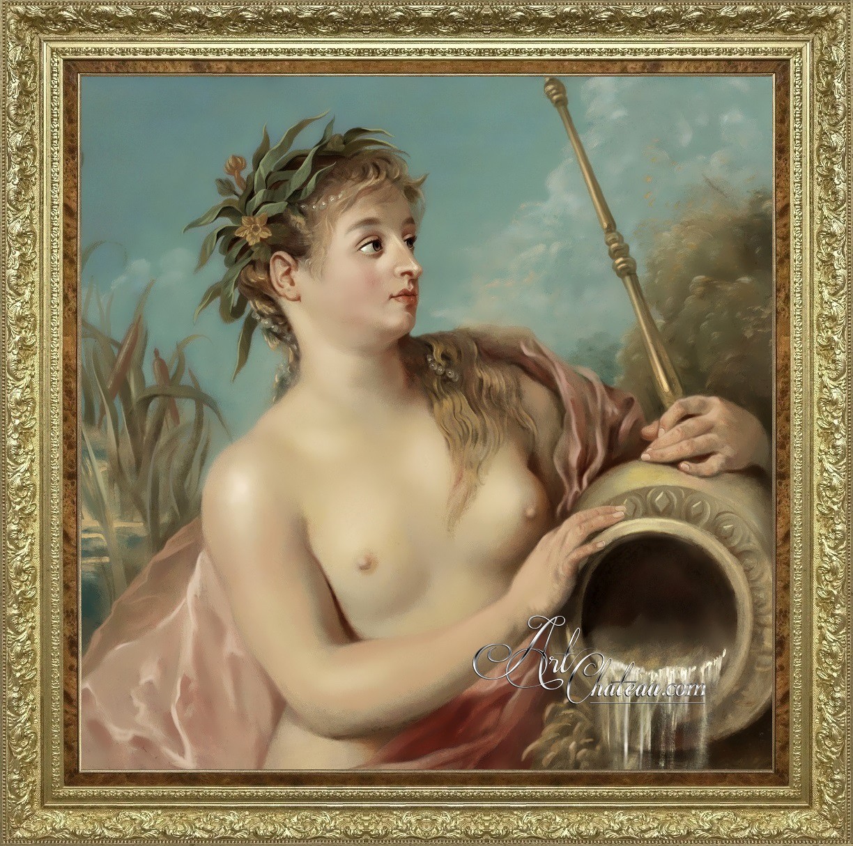 Artist Jean-Antoine Watteau helped transition French visual art from the classical and sober Baroque to the more light-hearted Rococo. Here we see Watteau's ability to render a traditional drawing-room painting of "Nymphe de Fontaine" captured with a light brushwork. This Mixed-Media tableau from Art Chateau is perfect for Classical Decorating and Luxury Homes in Piney Point, Houston, Texas.