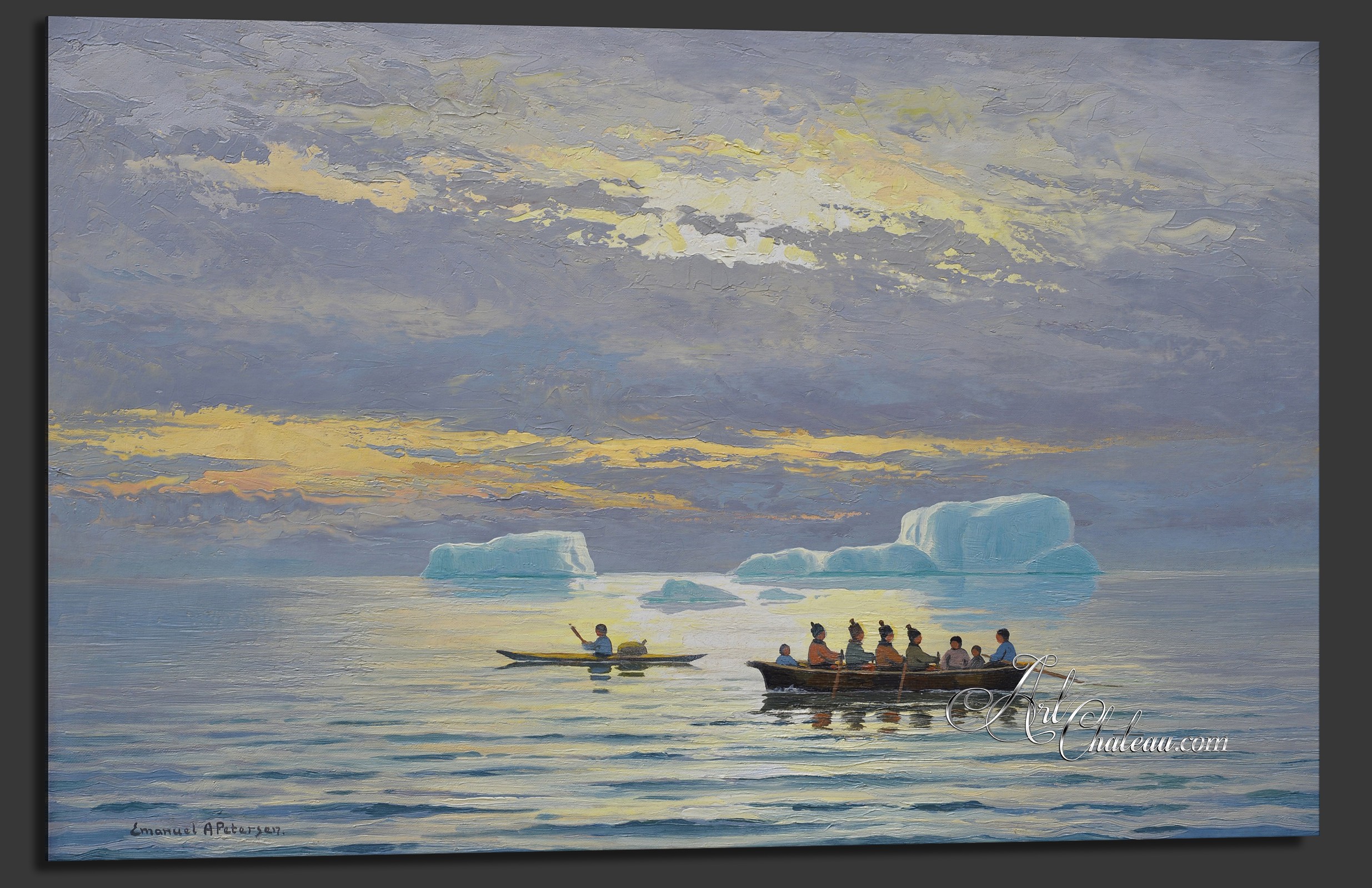 Danish painter Emmanuel Petersen spent much time in Greenland, rendering its plants, animals, natural beauty, and native people with their unique customs. Petersen’s paintings tried to awaken an appreciation for the island in his fellow Danes, hence his scenes are always sunny and never blustery. Here we see a typical Petersen painting showcasing native customs, and remastered at Art Chateau. |