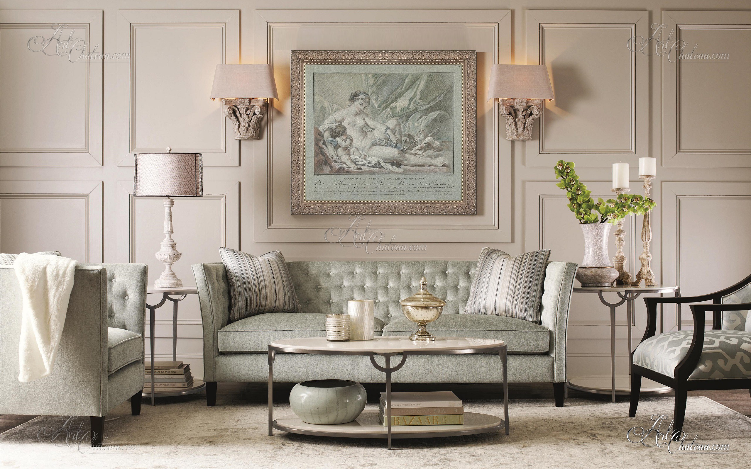 French Rococo artist Louis Marin Bonne was dramatically influenced by the prolific Francois Boucher. Bonnet excelled in the art of Pastel and produced a treatise entitled Le Pastel engraving where he discusses new advances in the technique. Over his lifetime composed hundreds of prints and drawings as we see here in his Venis and Cupid, a quintessential rendering. Remastered at Art Chateau. |