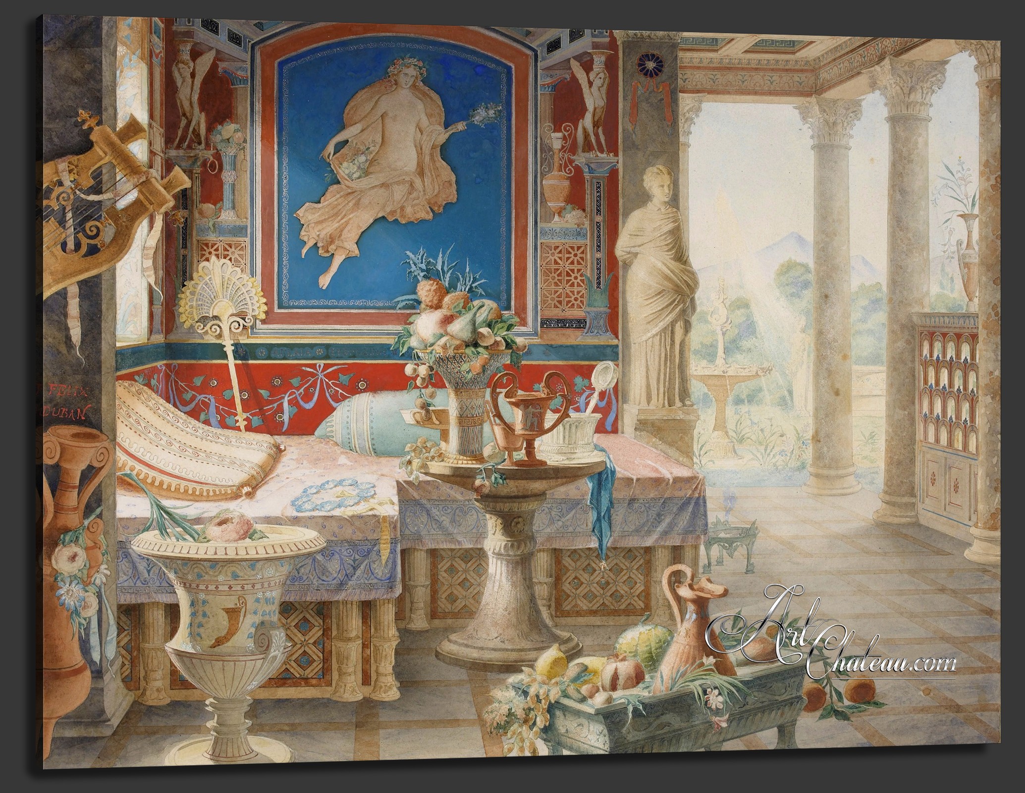 Born in Bourdeaux, France...architect Felix Duban was a designer in the Beaux-Arts tradition who was influenced by newly discovered Etruscan artifacts and the art from the great Rebirth encountered in his Italian travels. Here we see a caprice or imaginary architectural scene sketched by the master late in life in homage to the entombed city. A Mixed-Media work of art. |