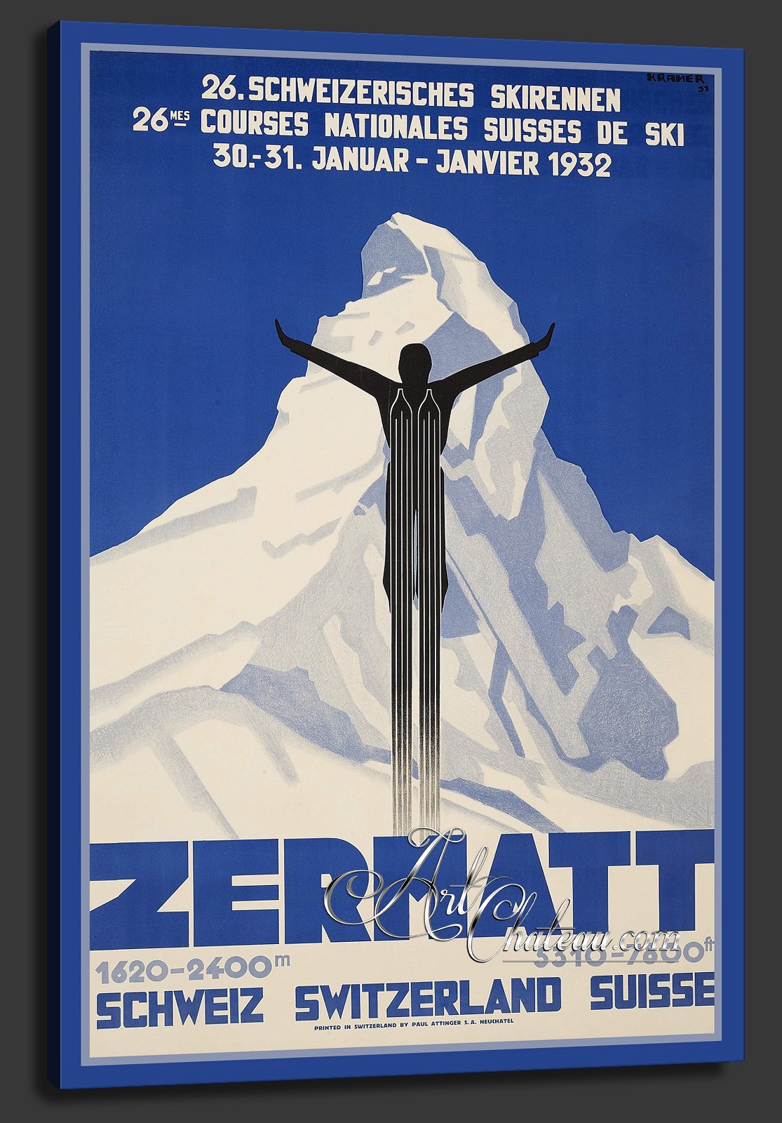This Art Deco Masterpiece by Kramer expressed the grandeur and majesty of the Swiss ski resort with its passion for winter sport. Our Mixed-Media canvas shows a perfectly balanced ski jumper, framed by the towering and distinctive outline of the Matterhorn in the background. |